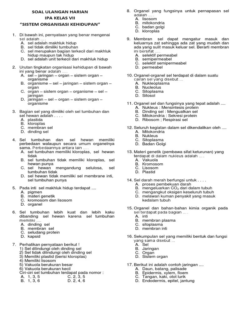 Soal dan kunci jawaban ipa smp pada materi organisme kehidupan, yang terdiri dari sel, jaringan, organ, sistem organ, dan organisme.
