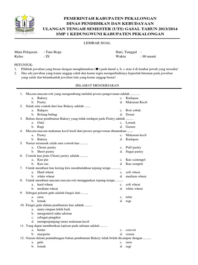 Soal Tataboga Kelas 7 : Logo Design : 1, latihan soal ukg online tata boga, tata boga smp, view.. Soal tata boga dan kunci jawaban kelas 12, soal tata boga kelas 5 sd semester 1, soal usbn tata boga smp, soal pilihan ganda jasa boga, . Mulok tata boga acuan : Buku pelajaran smp buku bank soal smp smart plus inti materi full pembahasan kelas 7 8. Of course i will order new essays again. Kurikulum tingkat satuan pendidikan ( ktsp ) alokasi .